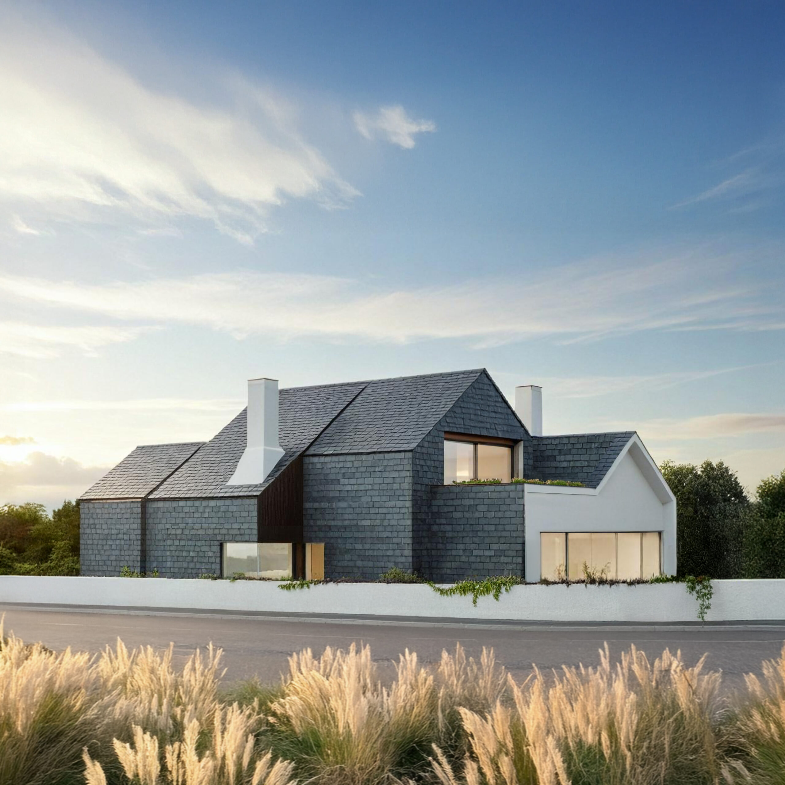 The design draws inspiration from the traditional fisherman’s cottages that line the steep, winding streets of the village. In particular, it references the distinctive hanging slate facades commonly found throughout Port Isaac. Slate, a vernacular material sourced locally from the historic Delabole Quarry, is used not only on the roof but also on the external walls, forming a natural protective shell against the harsh Atlantic weather.