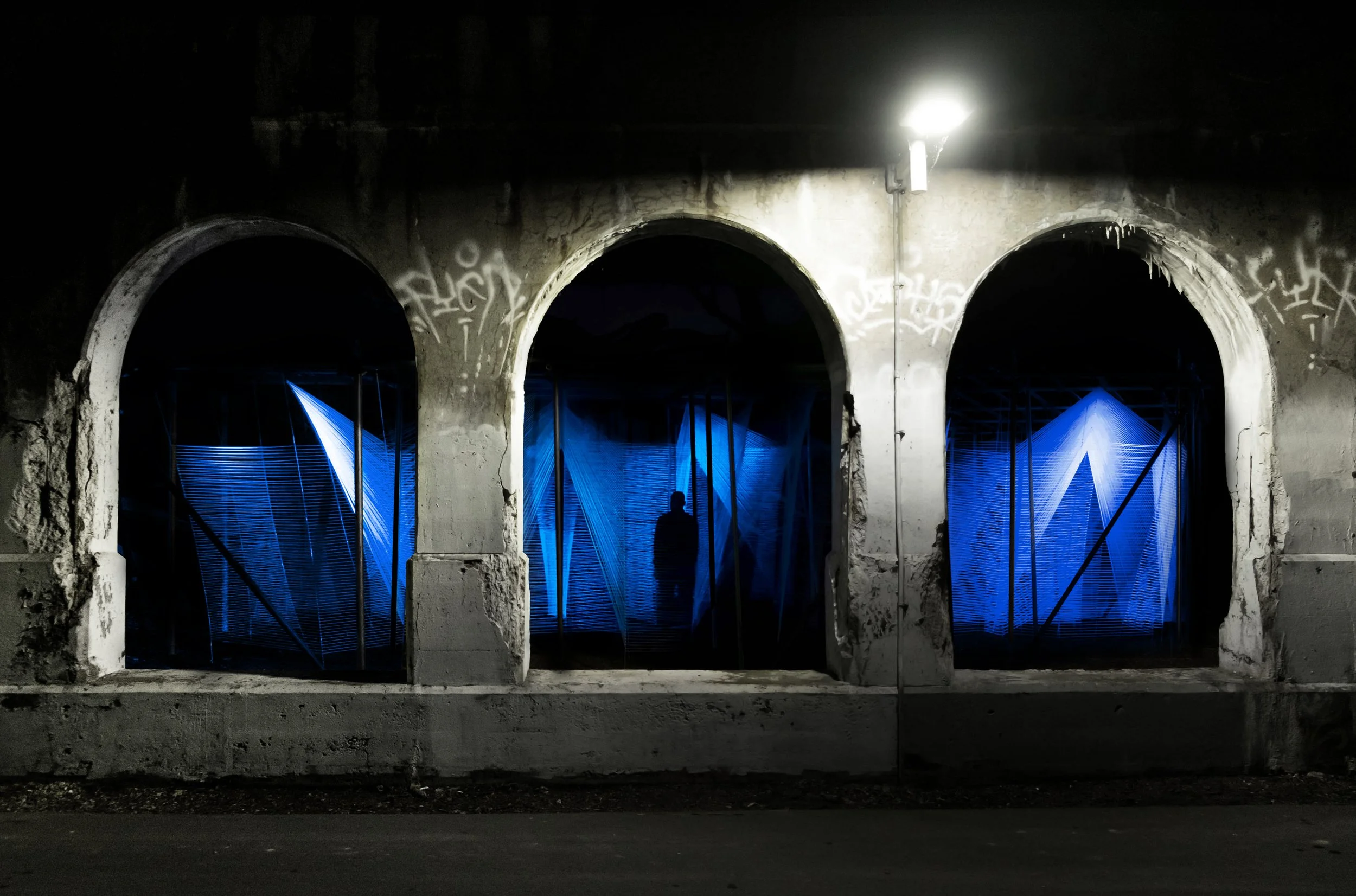 Lasermaze is an architectural installation formed from three miles of UV wool and over 3000 hand tied knots suspended from an industrial structure of steel scaffolding and chains created for the 2015 Detroit Design Festival. Lasermaze was located along the Dequindre Cut, a former railway line in Detroit that has been converted to a greenway and walking track.